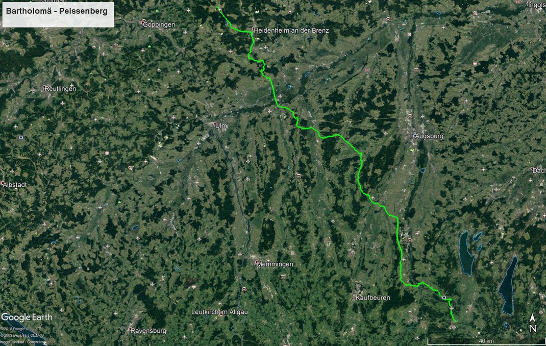 Bartholomä, Steinheim/Albuch-Heidenheim-Mergelstetten-Bolheim-Dettingen-Hürben-Stetten-Oberstotzingen-Niederstotzingen-Riedhausen-Günzburg-Denzingen-Deffingen-Kleinkötz-Hochwang-Deubach-Wettenhausen-Goldbach-Jettingen-Ried-Oberwaldbach-Grünenbaindt-Fleinshausen-Dinkelscherben-Ustersbach-Aretsried-Fischach-Willmatshofen-Tronetshofen-Siegertshofen-Mickhausen-Münster-Konradshofen-Schwabegg-Hiltenfingen-Langerringen-Hurlach-Igling-Erpfing-EIlighofen-Unterdießen-Fuchstal-Leeder-Denklingen-Epfach-Hirschau-Reichling-Rott-Wessobrunn-Zellsee-Patarzell-Blaik-Fendt-Peissenberg, 181 km