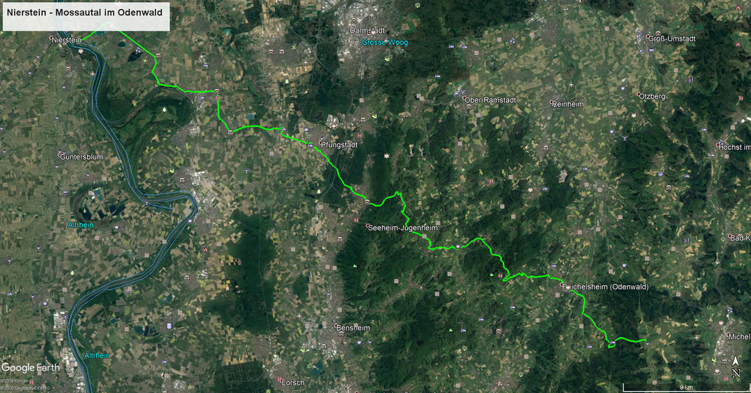 Niederlibbach-Wehen-Wiesbaden-Biebrich/Ufer-Mainz/Weisenau-Laubenheim-Bodenheim-Nackenheim¬Nierstein--Autofähre-Geinsheim-Leeheim-Riedstadt-Gooddela-Philippshospital-Crumstadt-EscholIbrücken-Pfungstadt-Seeheim-Oberbeerbach-Allertshofen-Modautal/Brandau-Neunkirchen-Laudenau-Kleingumpen-Relchelsheim-Frohnhofen-UnterosternRorbach-Obermossau-Untermossau, 127 km