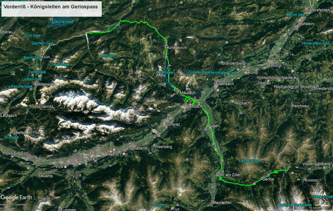 Kraftwerk Sylvenstein-Kaiserwacht/Achenpass-Achenwald-Achenthal-Achenkirch-Achensee-Buchau-Egg-Maurach-Wiesing-Straß/Zillertal-Schlitters-Fügen-Kapfing-Stumm-Aschau-Zell-Hainzenberg-Gerlos-Gerlospass-Ronach, 100 km