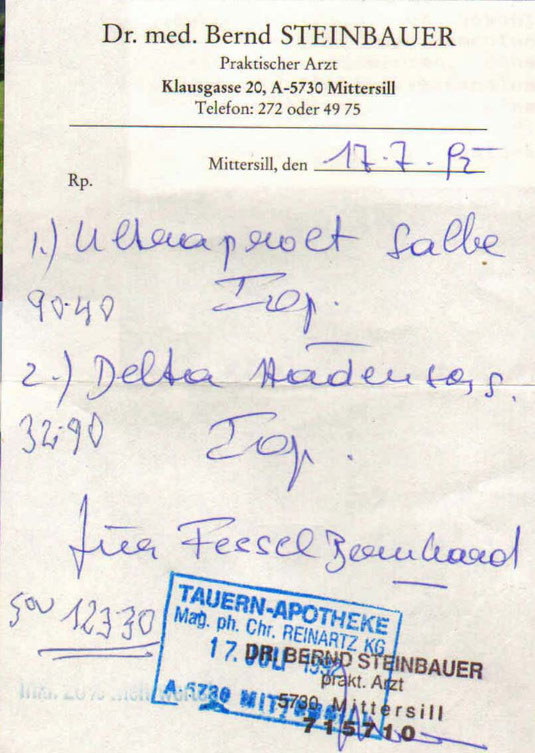 In Mittersill suchte ich einen Arzt auf. Ich bekam Nummer 14, schilderte ihm dann meine akuten Probleme, Hämorrhoidenschmerzen. Meine Salbe ging aus und eine schmerzhafte Verkrampfung im linken Schulter- und Halsbereich. Nachdem ich ihm auch erzählte, dass ich ins Virgental wollte, meinte er, dass wir uns dort vielleicht sehen würden. Aber noch umfassender unterhielten wir uns über das Problem A... Er hatte die gleichen Probleme. 10 Jahre schlug er sich damit herum. Seine Kinder wollten so gerne mit ihm in die Berge. Für ihn war das aber immer eine Qual. Dann endlich lies er sich operieren. In Würzburg und München gäbe es doch gute Spezialisten, meinte er. Ich sollte das auch tun. Es wird mit dem Alter nur noch schlechter. Wäre jetzt ein Arzt zur Stelle gewesen. Ich glaube ich hätte es gewagt. Nach einigen Medikamenten, eines gegen Schmerzen, einem Rezept für die A...-Behandlung für zwei Medikamente und einem Jaukerl (=Spritze) in die A...-Backe ging es gestärkt weiter.