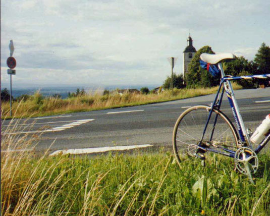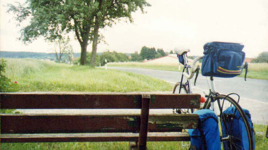 Nach 1/3 des ersten Berges fiel mir ein, dass ich den Zulassungsschein meines Autos doch meiner Frau zurücklassen sollte. Sie wollte mir mit dem Auto wenige Tage später folgen und mich unterwegs auflesen, oder am Zielort treffen. Da das Haus noch in Sichtweite war, fuhr ich nicht zurück. sondern pfiff, um die Aufmerksamkeit meiner Familie auf mich zu lenken. Leider reagierte keiner. Plötzlich kam Margit, meine Frau, mit dem Auto. Sie hatte mich deshalb nicht hören können, Sie wollte noch einmal Tschüß sagen. Bussi , Bussi und weiter ging es.