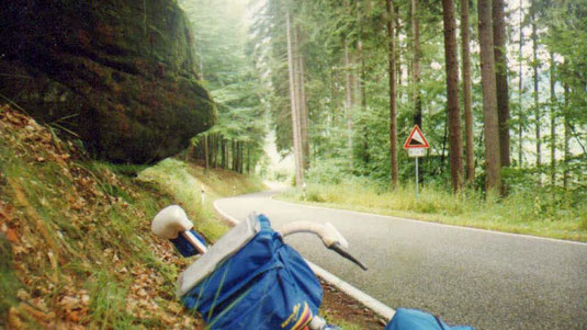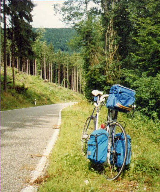 Dichter finsterer Wald, plötzlich ein Knall. Vor Erschöpfung fiel ich fast vom Rad. War wohl eine Sprengung in der Nähe.
