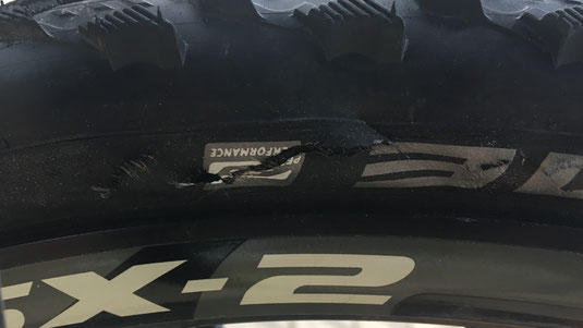 Gut, dass es das nicht ist. Es ist der Mantel des Hinterrades gerissen. Ein ganz neuer Mantel. Entweder ist es ein Materialschaden, oder er wurde beim Transport in der Bahn verletzt. Ich kam gerade noch bis zum Quartier und musste mir überlegen, wie ich zu einem neuen Mantel komme.