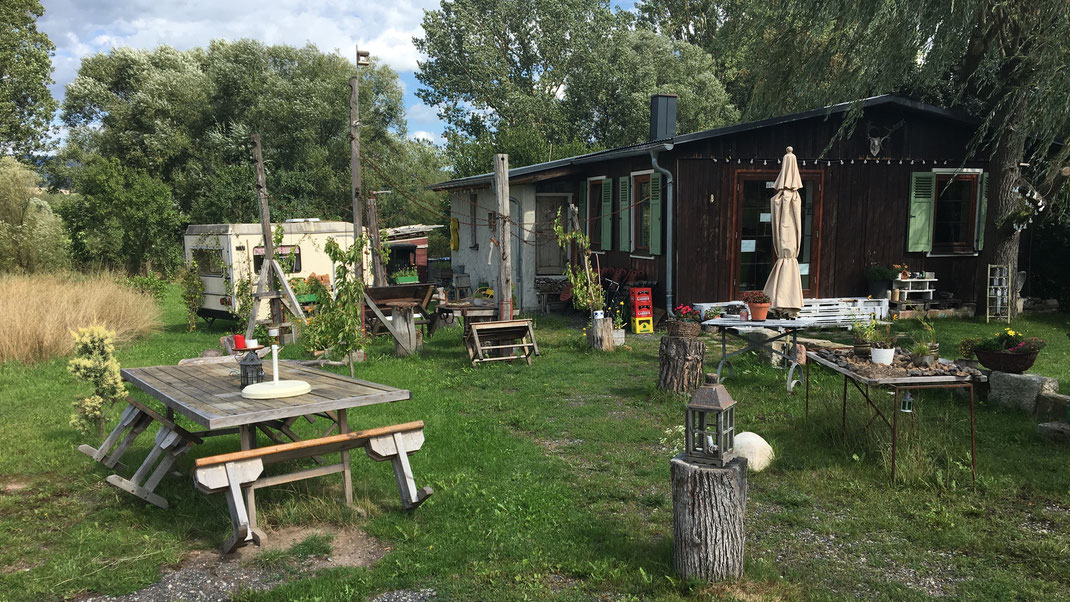 Im Eingangsbereich befindet sich eine Grillstube mit Biergarten, wo ich Würstchen und Bier genieße.